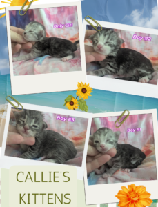 Callie and Eros have a litter of 4 sweet babies born by C-section on April 3. There are 2 boys and 2 girls, three of whom have little white feet! This is Eros’s first litter. This is also Callie’s final litter as she was spayed at the time of the delivery.