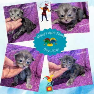 Misty has delivered her final litter of 4 beautiful black smoke kittens on April 1. There are 2 boys and 2 girls. We might keep one of the girls for the future.